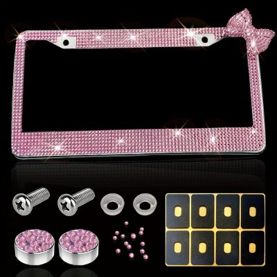 1 Pack Pink Bling License Plate Frames Shiny Cute Butterfly Tie Car Tag Holder For Women Girls Metal Sparkly Car Plate Frame With Bolts Screws Caps