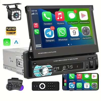 1Din Carplay Autoradio 7 HD Retractable Car Stereo HD Touch Screen Car Multimedia MP5 Player BT Car Radio Support USB AUX FM Radio Camera