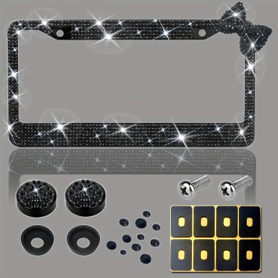 1Pack Black Bling License Plate Frames Shiny Cute Butterfly Tie Car Tag Holder For Women Girls Metal Sparkly Car Plate Frame With Bolts Screws Caps