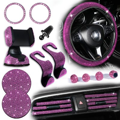 12pcs set Light Luxury Hot Artificial Diamond Car Interior Set Crystal Steering Wheel Cover Mobile Phone Holder Women Car Interior Accessories