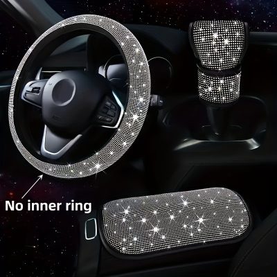 3pcs set Bling Artificial Diamond Steering Wheel Cover Universal Fit 15 Inch Rhinestone Center Console Cover Bling Gear Shift Cover Car Accessories