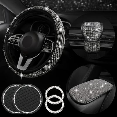 7Pcs Car Decoration Kit Car Accessories Car Steering Wheel Covers Set For Women Bling White Artificial Diamond Center Console Cover Pad