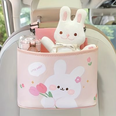 Cartoon Bear Car Trash Can Leather Cartoon Print Car Storage Bucket Hanging Multi function Car Storage Box Car Accessaries