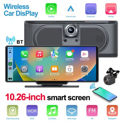 10 26 Inch Wireless CarPlay Android Auto HD IPS Touch Monitor Dual Lens Recorder Reversing Image Mirror Projection AUX FM Output Voice Control