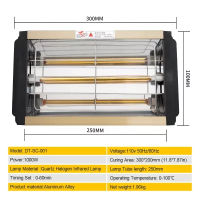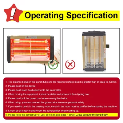 Anti-interference ,High thermal efficiency,Small power error,Strong penetration,Quick drying(drying for more than ten minutes),Anti-glare, non-dazzling,long life,Hit the concave point (fixed filament, can be vertical) ,Drying time comparison:Shortwave paint time is only 1/3 of the far infrared.