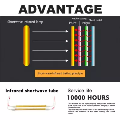 Anti-interference ,High thermal efficiency,Small power error,Strong penetration,Quick drying(drying for more than ten minutes),Anti-glare, non-dazzling,long life,Hit the concave point (fixed filament, can be vertical) ,Drying time comparison:Shortwave paint time is only 1/3 of the far infrared.