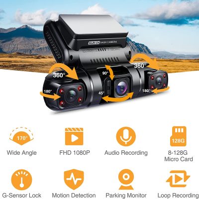 With 1080P front 170 wide angle + 1080P left 170 wide angle + 1080P right 170 wide angle, the driving recorder can record the super wide angle front, left and right roads at the same time. With 1080P front 170 wide-angle camera + 1080P left 170 wide-angle camera + 1080P right 170 wide-angle camera, the dash camera can record ultra-wide front and cabin at the same time.