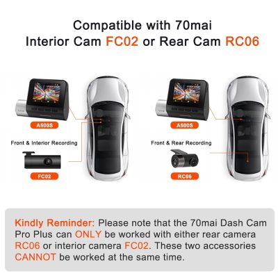2. For 70mai Interior Dash Cam FC02 and 70mai Rear Cam RC06/RC09, cannot be used at the same time.Because there is only one port on the A500S/A800S/A400.