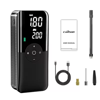 Battery compressor with digital display. In a set of 3 nozzles for different connectors and spare fuse Suitable for inflating the chambers of cars, motorcycles and bicycles, as well as for fast inflation of balls, mattresses, inflatable boats, etc. Comfortable, easy, not only throw it into the car, but also take it with you on a hike, pump up the boat, balls. In short, cool stuff. Plus can be used as a power bank and as a lantern, it also has such a function. Control is carried out by buttons. Display with bright backlight, in low light conditions with the device is convenient. The necessary pressure can be adjusted. The compressor is turned off when the desired pressure reading is reached. Comes in a branded box, for a gift super option. Ordered with delivery from Russia, received very quickly.