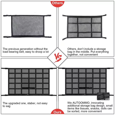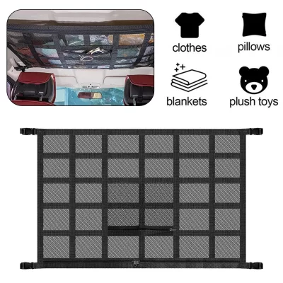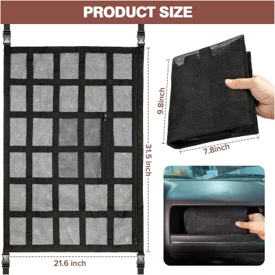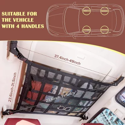 The upgraded SUV car ceiling storage net bag has 4 fixing buckles, baby quilts, children’s toys, tissues and other light sundries can be placed in the SUV ceiling storage net, the design helps to place many irregular shaped items, Transparent mesh design, then you can easily find your things instead of crawling into the back seat of the car to find them.