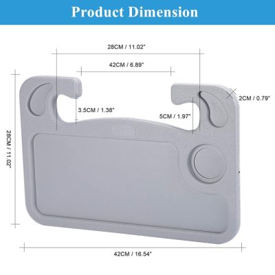 - Universal Fit — Size:28cm*42cm*2cm/11 inch*16.5 inch * 0.79 inch. Before you buy it, just check the size. Our Auto Travel Tray fits most vehicles steering wheels. This portable car tray is easy to install and clean. A good choice for sales people that are constantly on a business trip. A perfect travel companion.