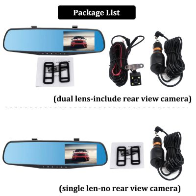 — Two Camera Lens: 1 * Package Box, 1 * Car dvr, 1 * Car Charger, 1 * User Manual, 1 * Rear lens with 6M cable