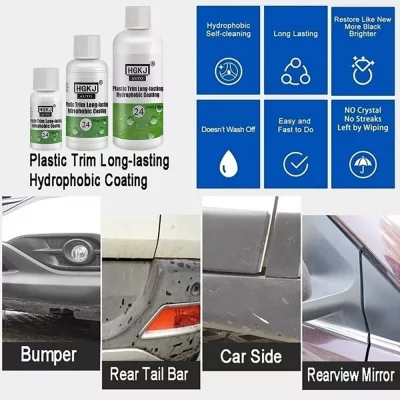 – Long Lasting – Water won’t wash it away – Hydrophobic / Self-cleaning – Restore Like New / More Black / Brighter – Car Plastic Trim Restore – NO Crystal / No Streaks Left by Wiping – Easy and Fast Operation