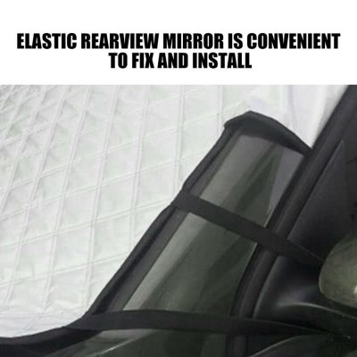 *No need other tools to install the the front windshield sun shade. The windshield snow cover has two small wings with which you can pinch it in the car door. Two side elastic bands will be hanged on the side rear mirrors. With 3 magnets of stronger suction inside, no need to worry the car windshield snow ice cover is blown by the wind any more.