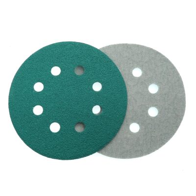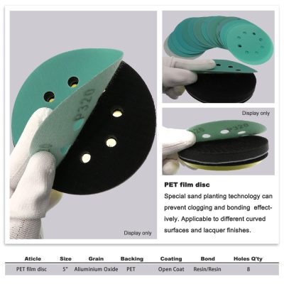 Proctduct Name: PET film green disc hook and loop Specifications: 5 inch 125mm, 8 holes Grits: 60/80/120/150/180/240/320/400/600/800/1000/1200/1500/2000 Features: – PET backing, high strength, long lifetime – Good flatness, for wet and dry sanding – Special sand planting technology can prevents clogging and bonding effectively – Applicable to different curved surfaces and lacquer finishes