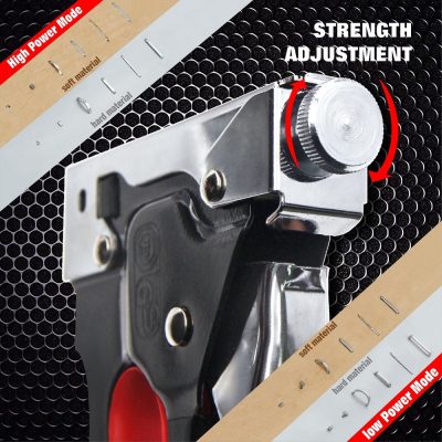 The staple gun has an adjustment knob featured at the top, designed to adjust the force to be exerted on the fastener to drive it deeper into the work piece.